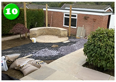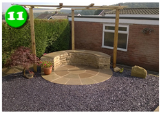 We also installed a secondary patio circle sitting area with integrated pergola. We used half of the outer circle as a raised seating area sat on a mortared curved stone wall, an attractive and interesting solution to add creativity to this area.